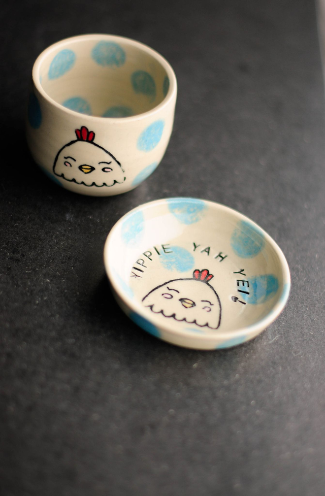 Dieses YIPPIE YAH YEI Set wurde an der Töpferscheibe gedreht. Mit einem Siebdruckverfahren wurde der Hühnchen auf die Keramik übertragen, von Hand bemalt und glasiert und bei 1230 Grad gebrannt. Die Glasuren entsprechen den Anforderungen für Bedarfsgegenstände. Das Set ist sowohl spülmaschinenfest als auch mikrowellengeeignet. Um länger Freude an den Produkten zu haben, empfehle ich jedoch die gute, alte Handwäsche.