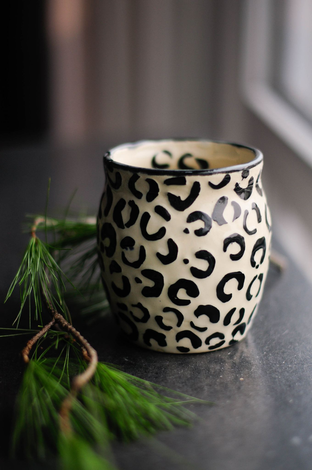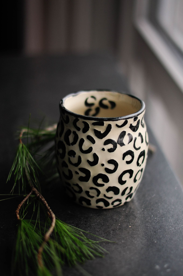 Diese Vase wurde an der Töpferscheibe gedreht. Durch eine besondere Technik wurden die Leo Flecken mit dem Pinsel freihand gemalt und danach übermalt. Durch ein spezielles Wachs wurde die überschüssige Farbe abgetragen, so dass die Leo Flecken erhabener sind und somit haptischer. Danach wurde die Vase transparent glasiert und bei 1230 Grad gebrannt. Die Glasuren entsprechen den Anforderungen für Bedarfsgegenstände. Die Vase ist spülmaschinenfest. Um länger Freude an dem Produkt zu haben, empfehle ich jedoch die gute, alte Handwäsche.