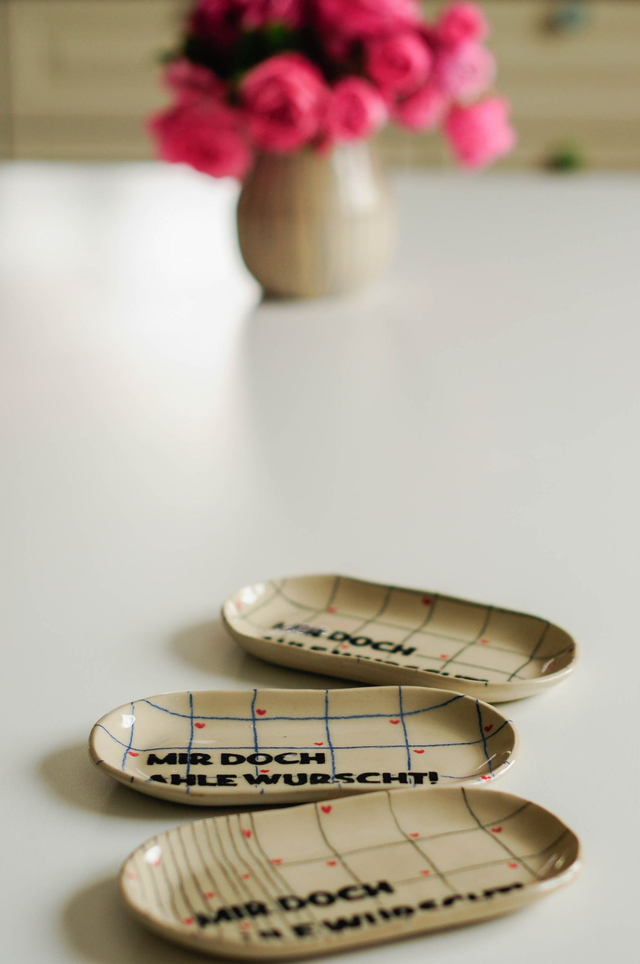Bei 1230 Grad gebrannt. Die Glasuren entsprechen den Anforderungen für Bedarfsgegenstände. Spülmaschinenfest und mikrowellengeeignet. Um länger Freude an dem Produkt zu haben, empfehle ich jedoch die gute, alte Handwäsche.